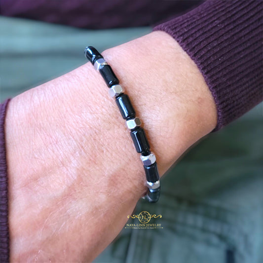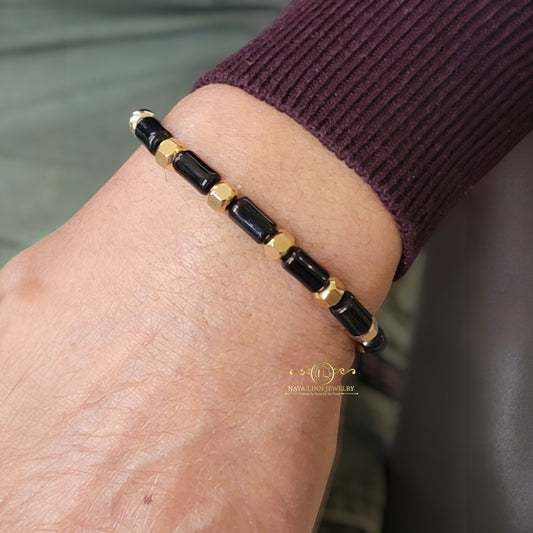 Xanthus Minimalist Men's Bracelet, Black Agate Rectangular Beads with Adjustable Rope