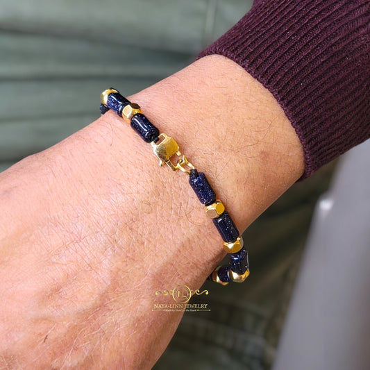 Hector 6x10MM Blue Sandstone Men's Bracelet, 18K Gold Plating with Lobster Clasp