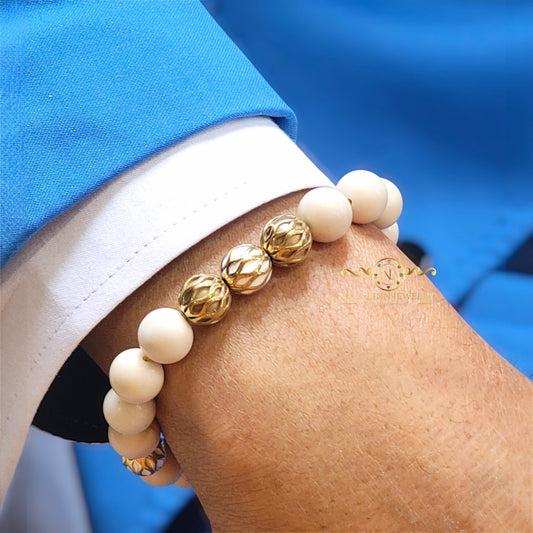 Zeno Men’s Gold Plated Bracelet, 10mm White Fossil Gemstones with Lobster Clasp
