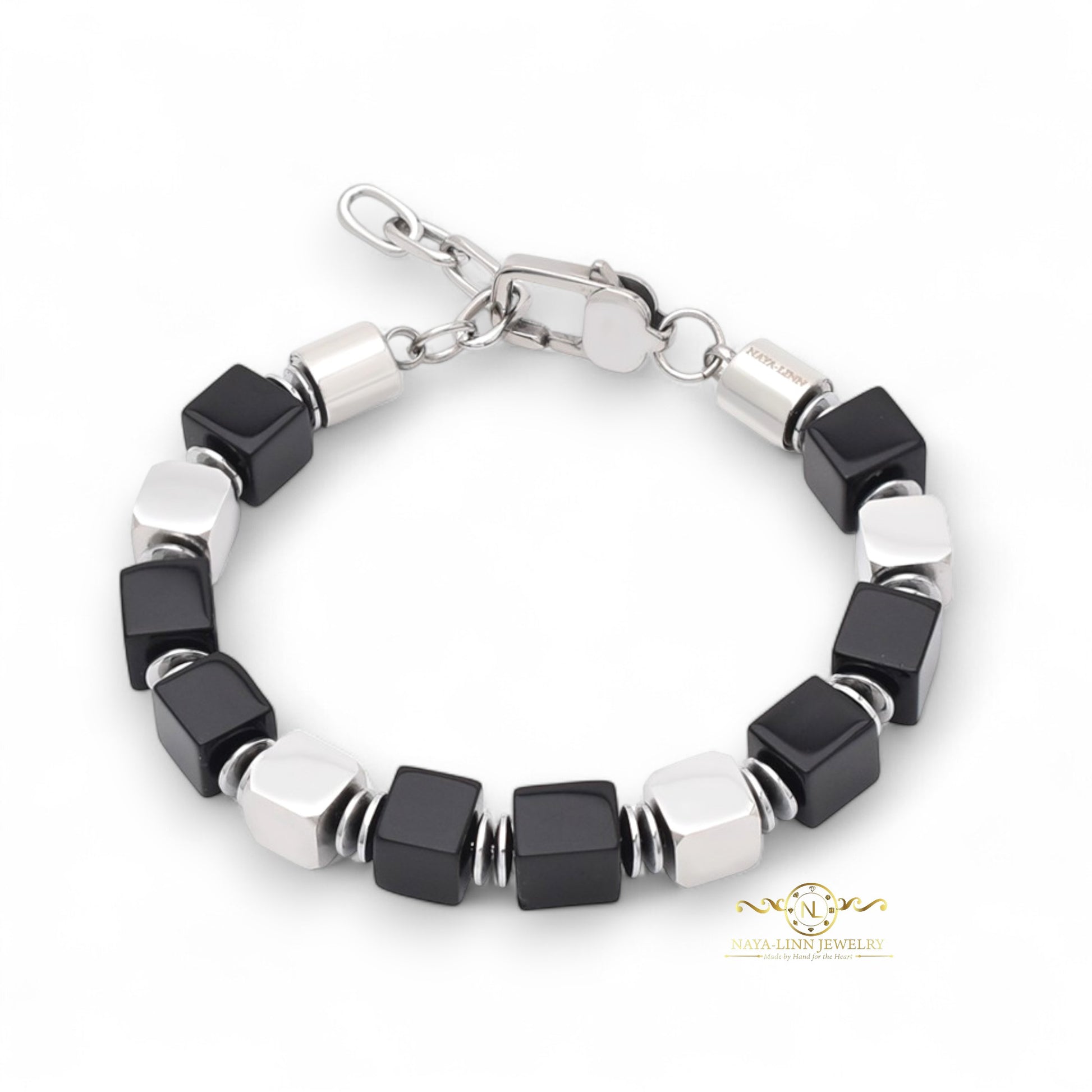 The Caesar Men’s Bracelet is a refined, 8x8mm square-cut natural stone bracelet crafted to elevate any occasion. Available in Tiger’s Eye or Black Agate gemstones, it’s accented with either 18k triple gold plated polished stainless steel or plain stainless steel for a versatile, luxurious finish. A secure lobster clasp and extension chain ensure a comfortable fit.