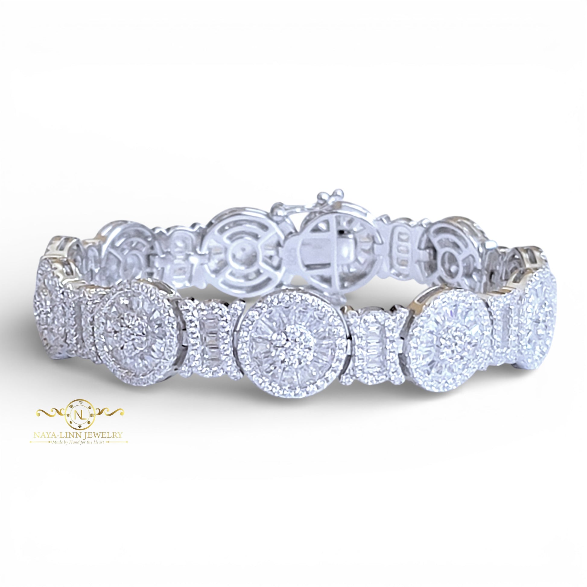 Empress Bracelet is a statement piece with its sophisticated ensemble of multiple small pieced mixed cuts designed to offer a refined look. Perfect for night outings or formal gatherings, this bracelet presents a blend of baguette and round cuts interwoven to create a true masterpiece. Rhodium plating over 925 Sterling silver aids this bracelet to exude both elegance and durability.