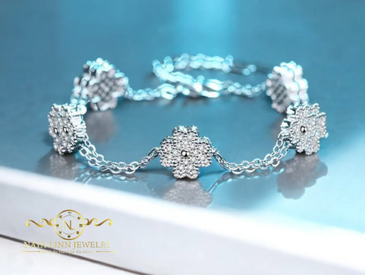 Alice Bracelet | Four Leaf Clover Bangle | Moissanite Diamond Chain Bracelet | 14K White Gold Plating | 925 Sterling Silver | Wedding Gift