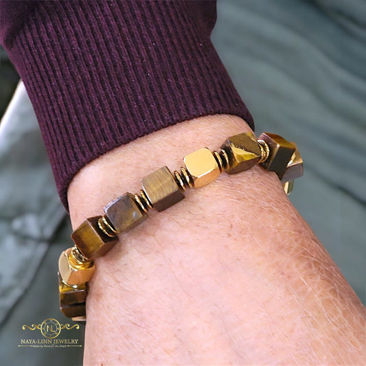 Caesar Men’s Bracelet – 8mm Square Tiger’s Eye or Black Agate Beads with 18k Gold Plated or Stainless Steel Accents