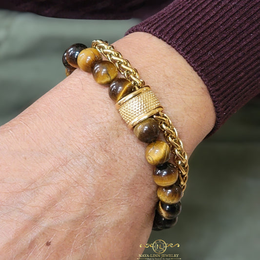 Lee Men’s Double Decker Bracelet with 10mm Tiger's Eye Beads & 18K Gold-Plated Link Chain