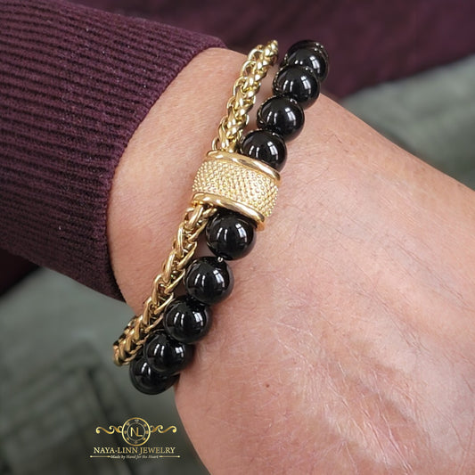 Lee Men’s Double Decker Bracelet with 10mm Black Agate Beads & 18K Gold-Plated Link Chain