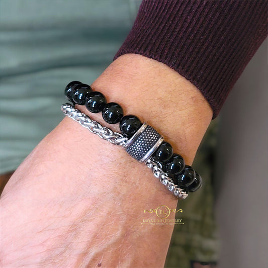Lee Men’s Double Decker Bracelet with 10mm Black Agate Beads & Link Chain